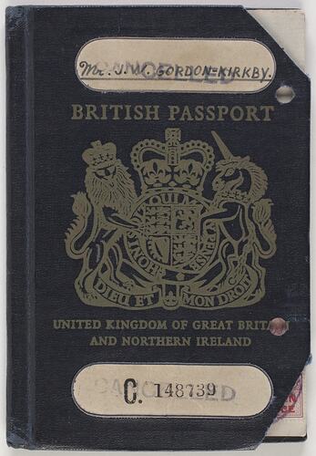 Text: Mr. J. GORDON-KIRKBY/BRITISH PASSPORT/UNITED KINGDOM OF GREAT BRITAIN/AND NORTHERN IRELAND/C. 148739.