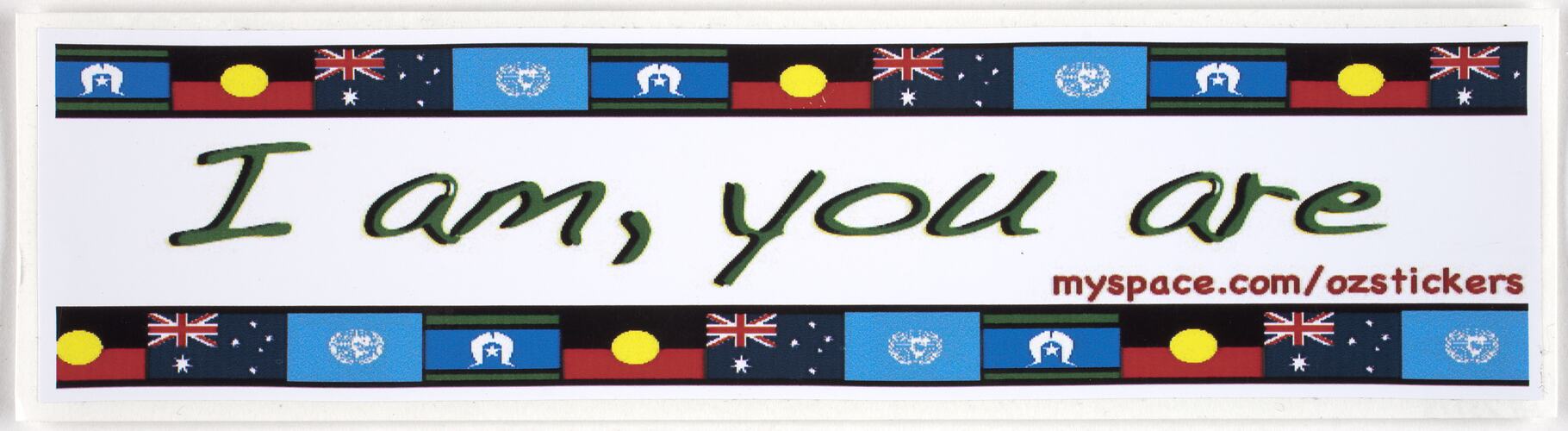 White sticker on white backing paper. Slogan is in the centre in green "I am, you are" and above and below this are the Torres Strait, Aboriginal, Australian and United Nations flags. Just below the slogan in red is: "myspace.com/ozstickers".