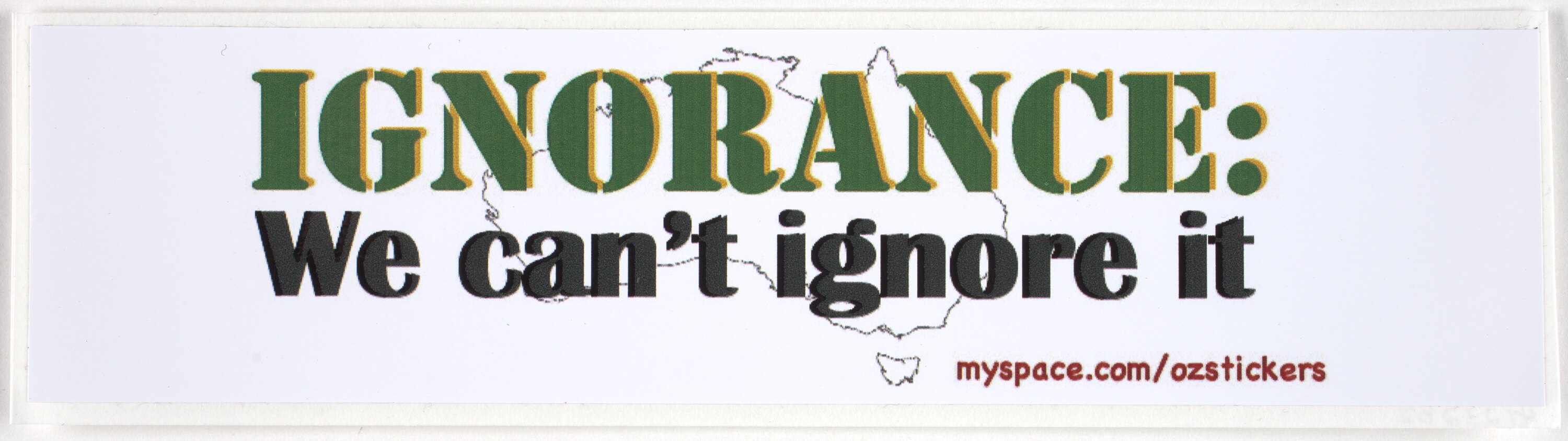 Printed, front: "IGNORANCE: We can't ignore it / myspacxe.com/ozstickers"
