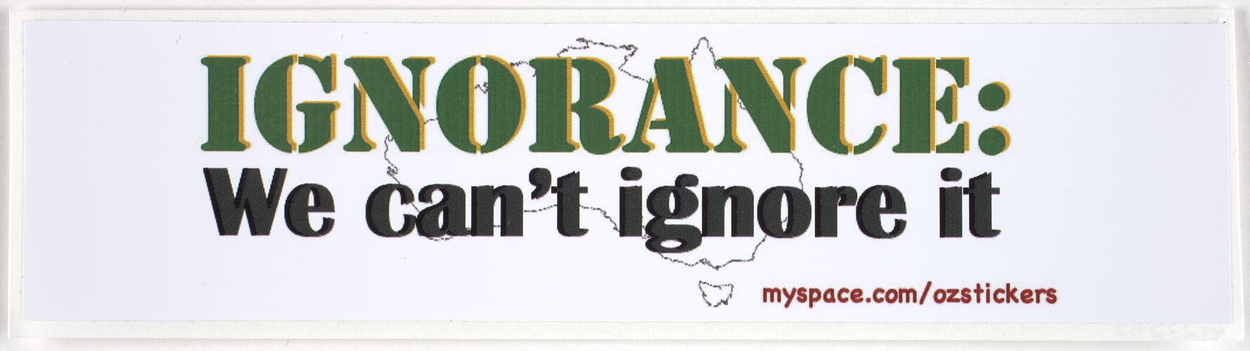 Sticker with the slogan 'Ignorance: We Can't Ignore It' produced by Australians Against Racism and Discrimination in Sydney in 2008. The sticker was produced to counteract racism in Australian society, and was sold through the social networking sites of MySpace and Facebook in 2008 and 2009, and from 2009 at the website ozstickers.com. The slogan is a call to actively work against ignorance and to educate people about different cultures rather than perpetuating myths and stereotypes.