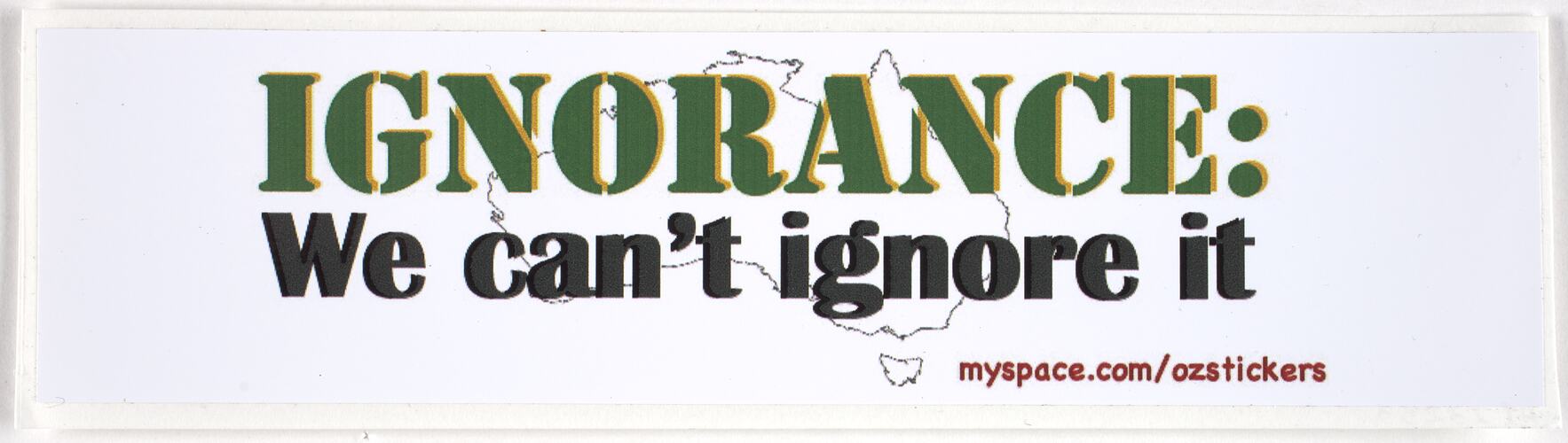 Printed, front: "IGNORANCE: We can't ignore it / myspacxe.com/ozstickers"