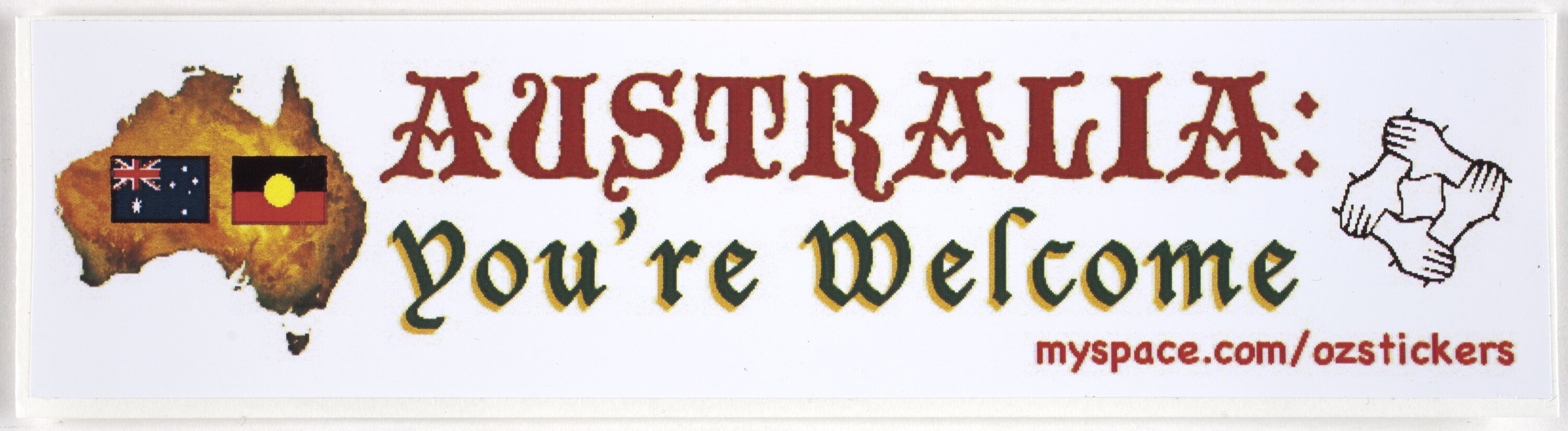 Sticker with the slogan 'Australia You're Welcome' produced by Australians Against Racism and Discrimination in Sydney in 2008. The sticker was produced to counteract racism in Australian society, and was sold through the social networking sites of MySpace and Facebook in 2008 and 2009, and from 2009 at the website ozstickers.com. The slogan is meant to send a positive message that Australia 'welcome's migrants.