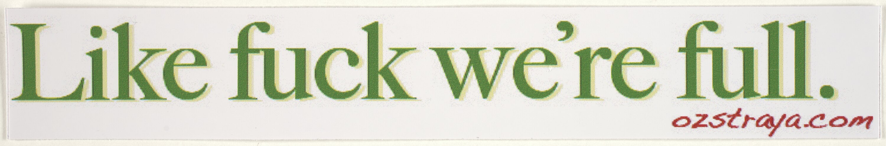 Printed, front: "Like fuck we're full. / ozstraya.com"