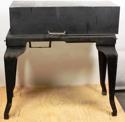 Key punch with electric motor fitted onto cast iron base with black japanned finish and curved legs; lid with three flanges to add strength in open position attached by three hinges on back section to cover the punch mechanism; this is probably a later addition as it is made of plain black metal sheet with chrome handle. Small micro-switch attached to the front of punch below the keys with red wire fed into the interior on right hand side adjacent to the card stack. Micro-switch made in Australia. This is also probably a later addition to modify the machine. On right hand side is a detachable chrome double H weight with screw to hold card stack. Separate black holder, on left hand side, was used to receive cards; presently detached. Side table extension could be attached to left hand side is missing. Two circular electric sockets in rear with pins. Power buttons on right hand edge Two buttons - one black/one white