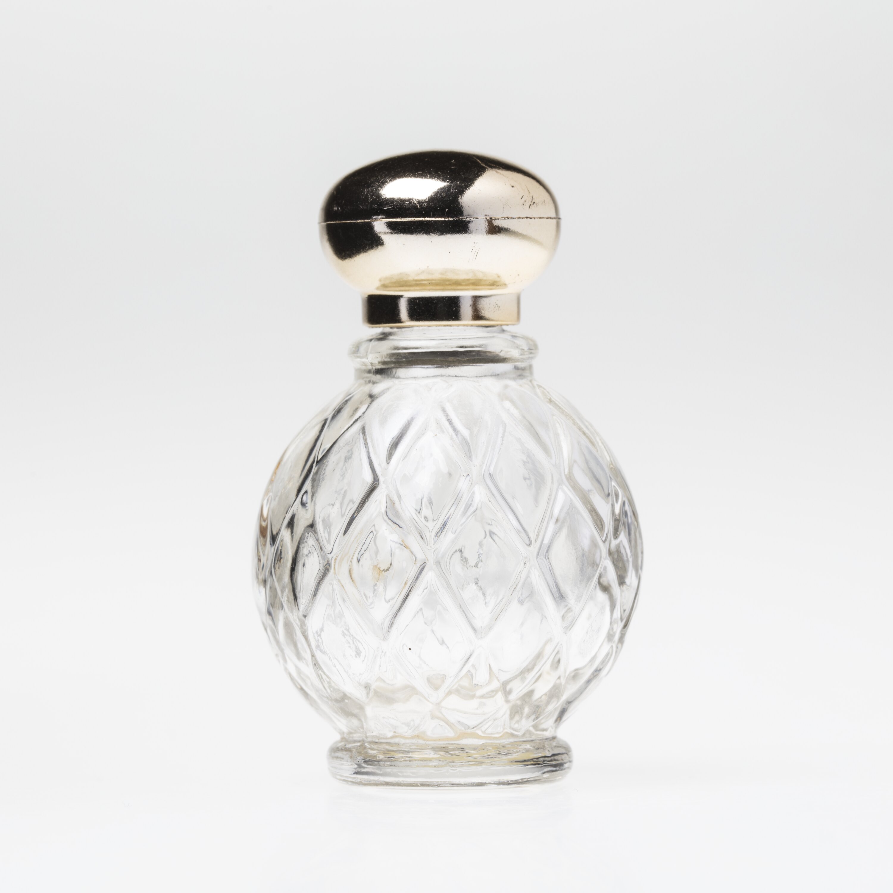 Clear glass perfume bottle with diamond faceting and plastic gold screw-off lid. Empty.