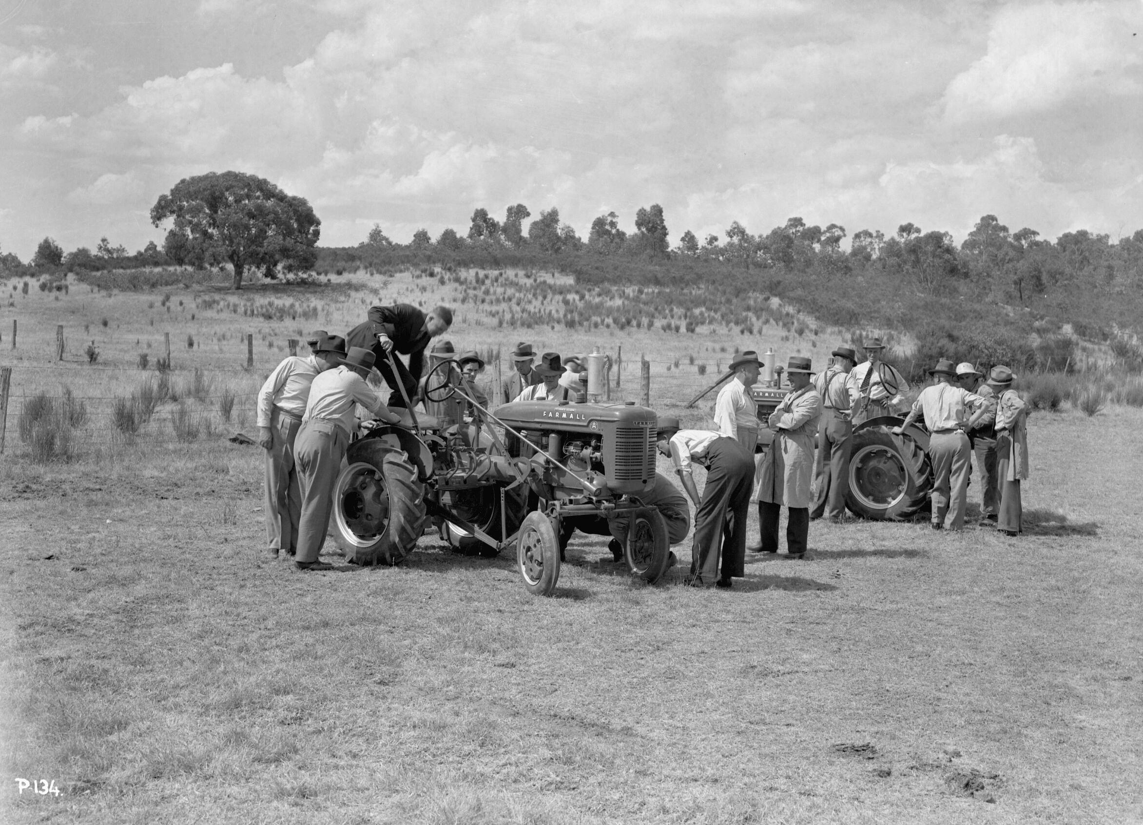 Group of International Harvester salesmen inspecting two Farmall A tractors at Bendigo, 16 January 1940.