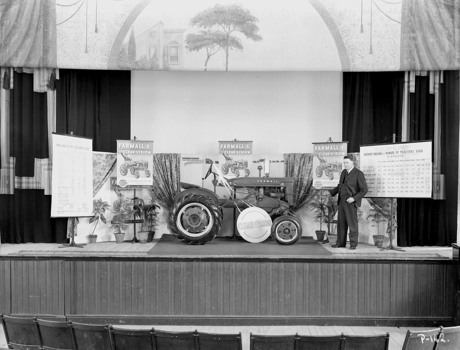 Man identified as 'Mr Irwin' standing on the stage of a hall with a Farmall A tractor surrounded by potted plants and promotional signage. Taken 17 January 1940 during a promotional tour of Victoria and southern NSW.
