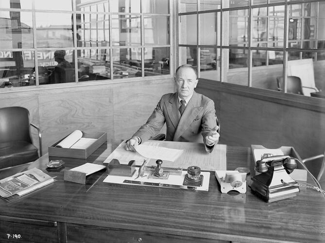 A man identified as Mr Woods sitting behind a desk at the Iinternational Harvester Co. head office in South Melbourne, 26 February 1940.