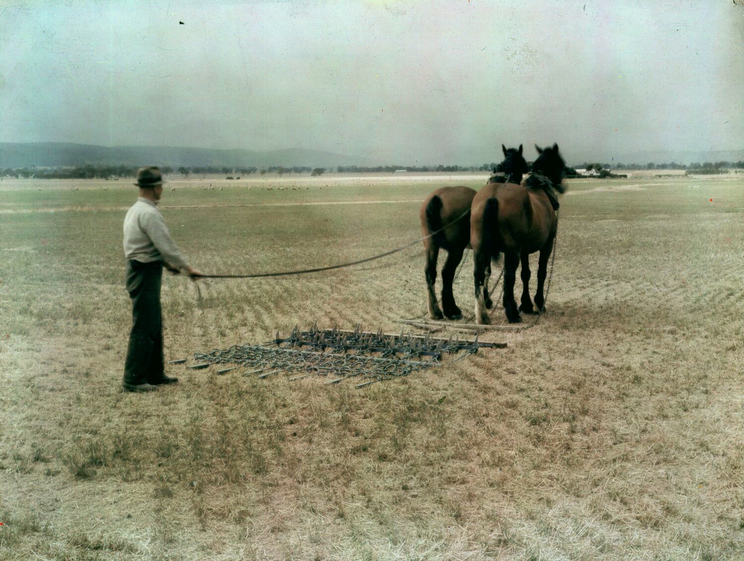 Male holding the reins of a two-horse team pulling a pasture harrow in a cropped field, 26 February 1940. Photograph possibly taken on Mr G. Peter's property near Balliang, Victoria (see MM 115032).