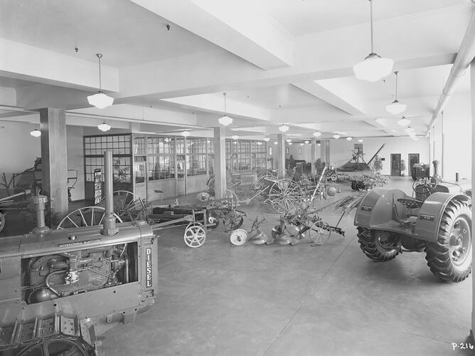 Interior of International Harvester Company Showroom at Harvester House, City Road, South Melbourne. Showing a diesel crawler tractor (at left) and pnuematic tyred W-40 tractor (at right). Behind are other implements including mouldboard and disc ploughs and cultivators, fertilizer & seed drills, further tractors, small engines, a harvester (extreme left behing column) and a reaper (far back). Behind the implements in the left background is a row of five offices with glazed partitions.
