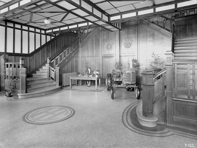 Interior of the main foyer or the International Harvester Co's Harvester House, at City Road, South Melbourne. The foyer is finished in an 'art deco' architectural style with extensive polished wood panelling and two mirror image staircases. The ceiling features multiple geometric panels and an ornate hexagonal suspended electric light fitting. In the centre of the floor is embedded a large circular style "IHC" logo. In the left-hand rear corner a female receptionist sits behind a large table close to a large hydroponic heater mounted below the stairs. In the centre between the two stairways is a new Farmall A-model tractor on pneumatic tyres. Various pot plants are arranged around the foyer.