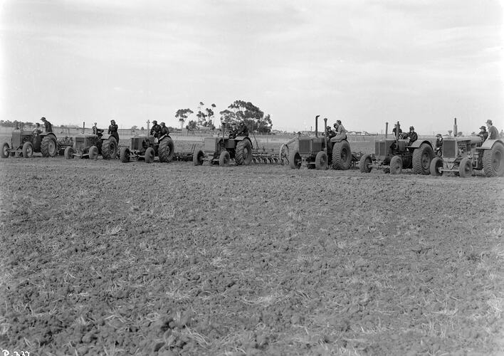 Taken at Sunshine on 6 April 1940. Women's Auxiliary Training League members learning to drive tractors with towed implements. The WATL members were to provide a reserve of qualified machinery operators on farms as males left to join the armed services during the World War II. This training at Sunshine was sponsored by the Power Farming Association and 18 drivers were trained with tractors donated by seven agricultural equipment suppliers including International Harvester. A crop of wheat was sown as part of their training.