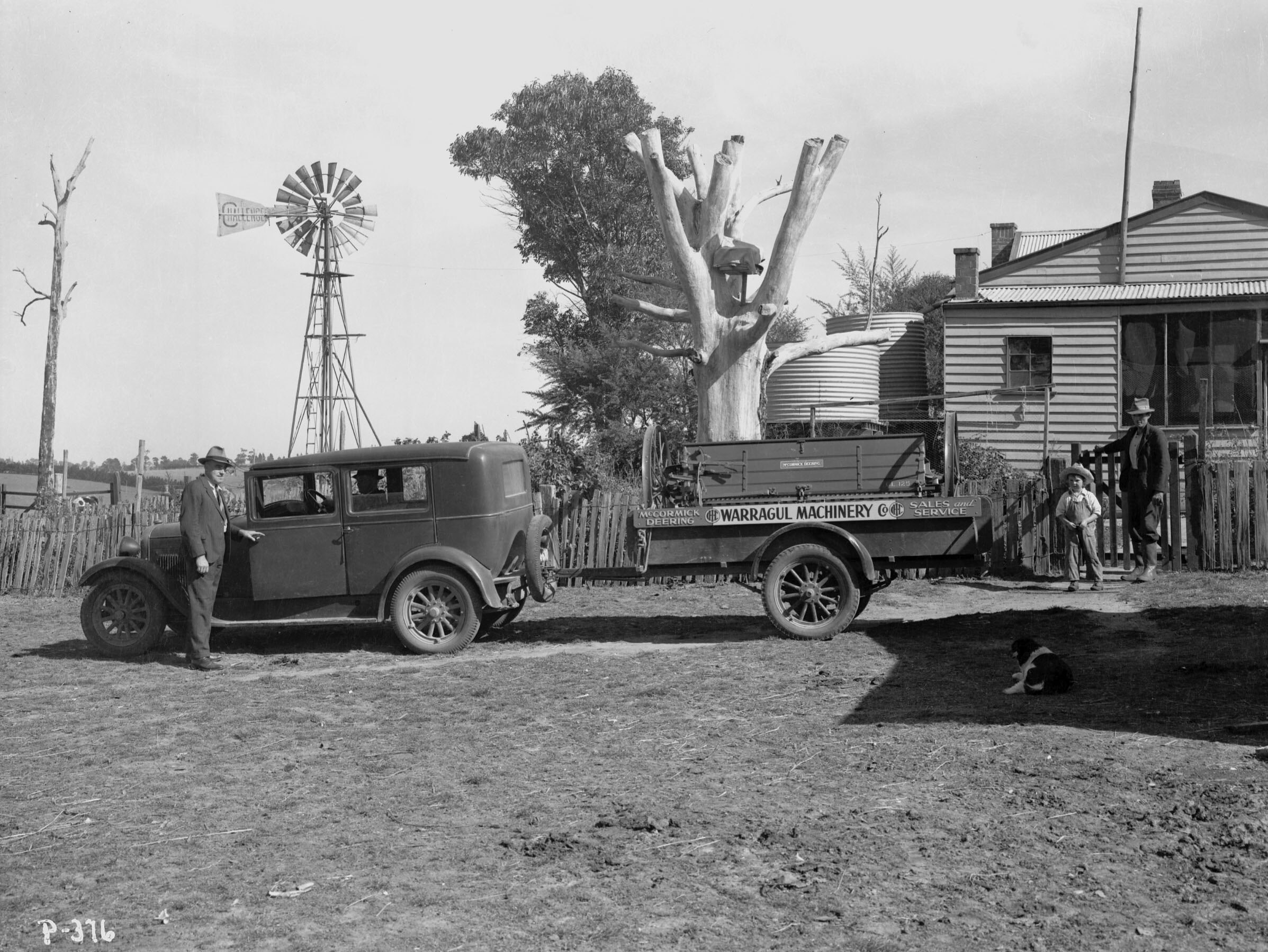 Taken 23 April 1940. Jim McDonald (salesman) demonstrating a McCormick-Deering fertilser spreader to Mr Glenn of 'Bona Vista' via Warragul, Vic. A 'Challenger' windmill is in the background.