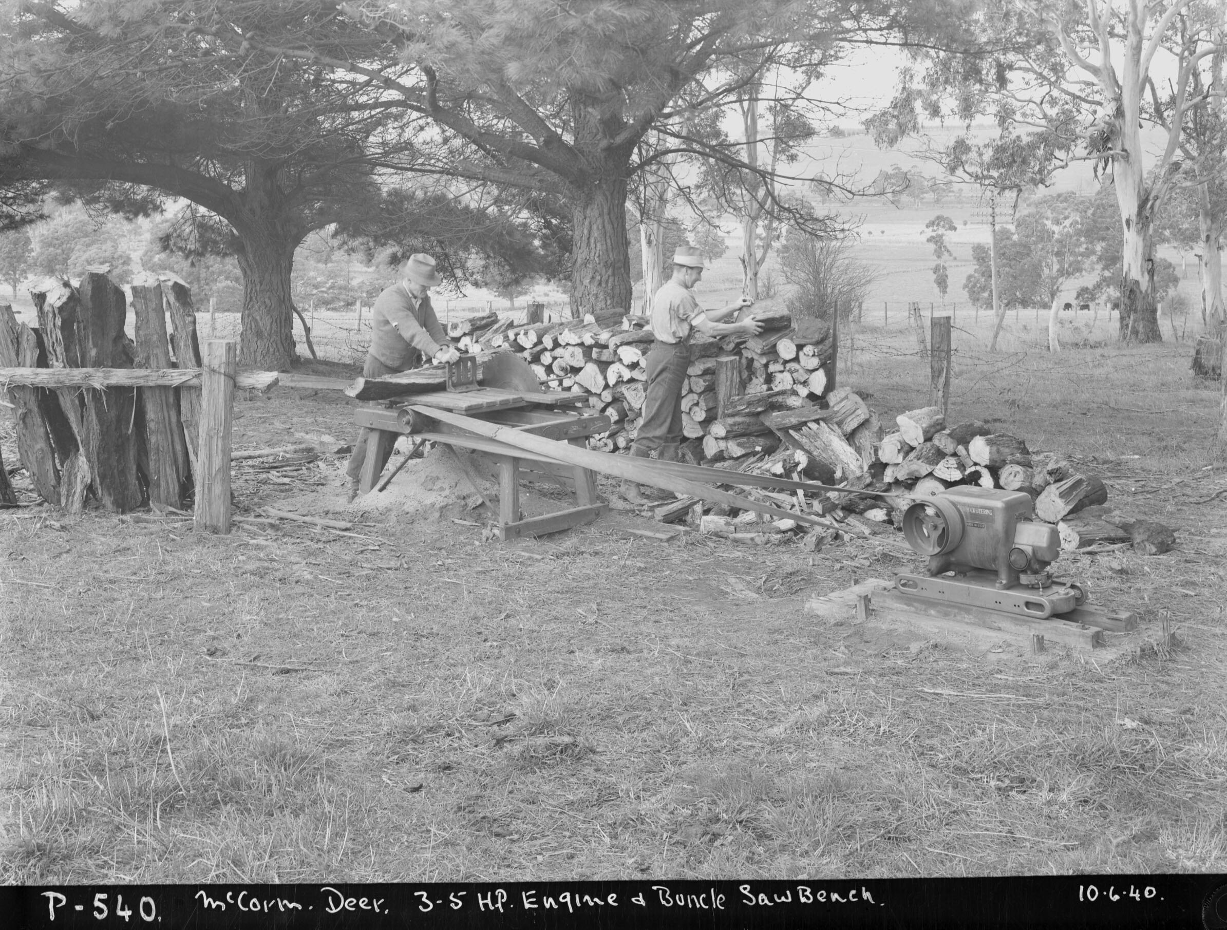 Cutting timber with a Buncle portable saw bench. Taken 10 June 1940. Location is Mr R. Clark's property at Warragul, Victoria.