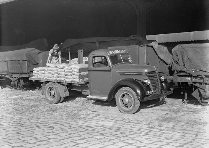 Taken 12 July 1940. International D30 motor truck with flat bed tray loading bags from open railway goods wagons. J.McCann & Son Pty Ltd signwriting on cab of truck. This firm supplied lime and cement and had premises at 12 Moray Street South Melbourne.