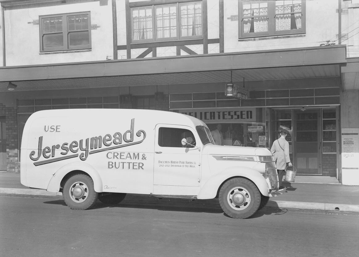International D15 motor van belonging to Bacchus Marsh Foods. Advertises 'Jerseymead' Cream & Butter.