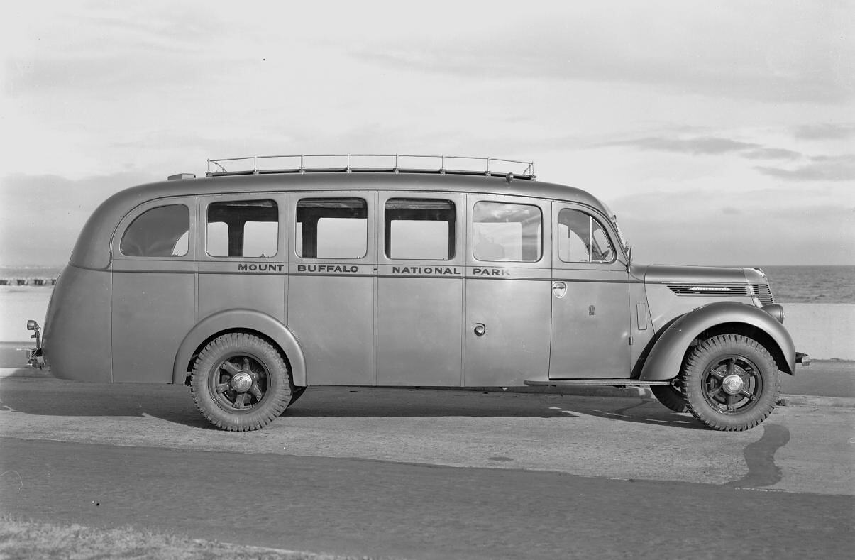 International D35B motor bus. Used to transport tourists to the chalet at Mt Buffalo, Victoria. Taken 7 August 1940.