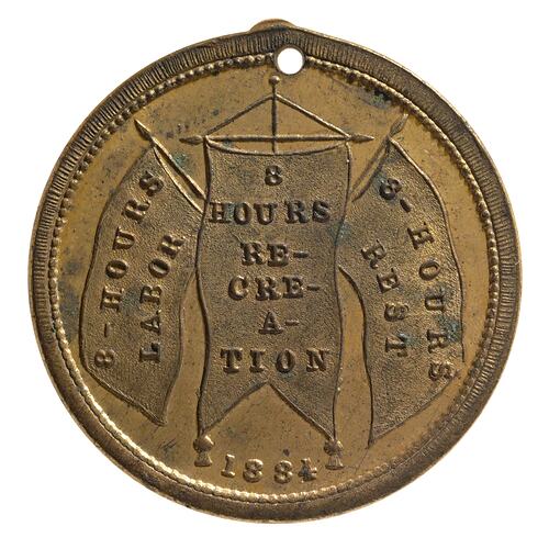 Medal holed for wearing issued to mark the Eight Hour Day movement in 1884.