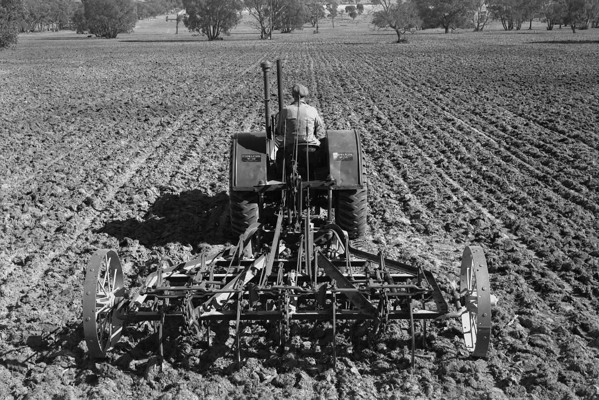 Rear view of a 8-foot GL-30 scarifer attached to a McCormick-Deering W-30 tractor at the property of C. Rokei, Shelbourne, Victoria. Taken 29 April 1941.