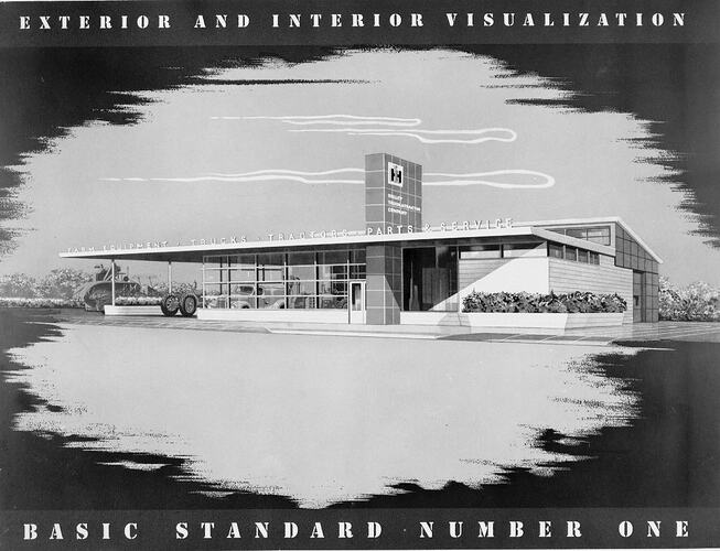 Concept exterior design drawing of the standard ' Basic Concept No. 1'. 'Base of Operations' design for IHC dealerships by industrial designer Raymond Loewy.