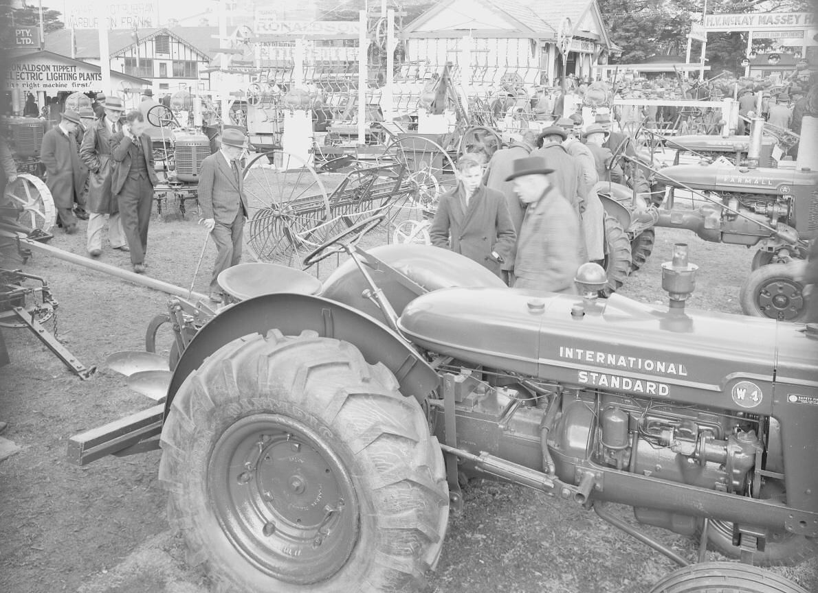 Crowd inspecting the International Harvester Co. of Australia tractor display area at the 1946 Royal Melbourne Show. International W-4 and Farmall A model tractors at right.