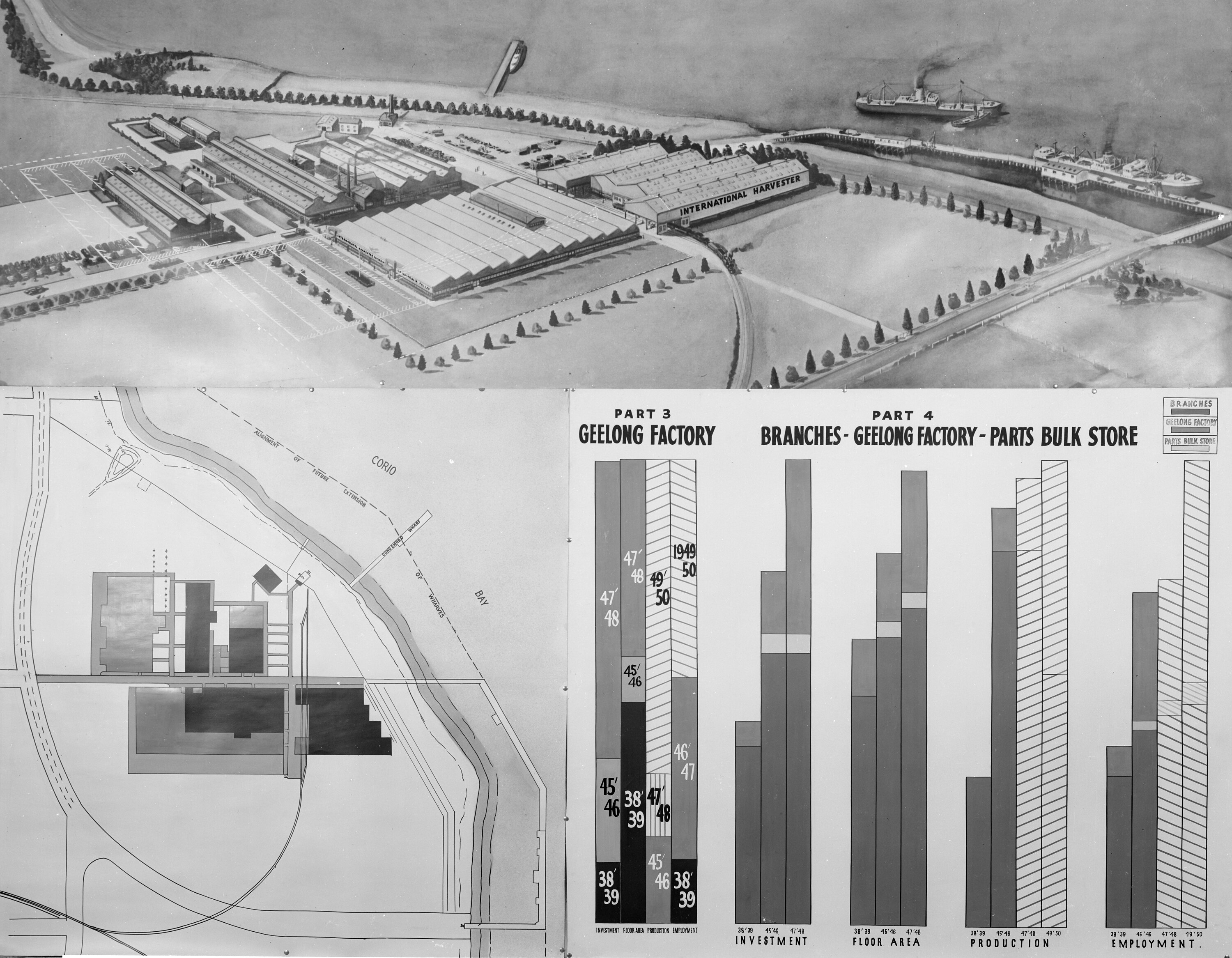 Illustration of Geelong factory with new extensions marked and a bar chart showing production, investment, floor area and employment since 1938.