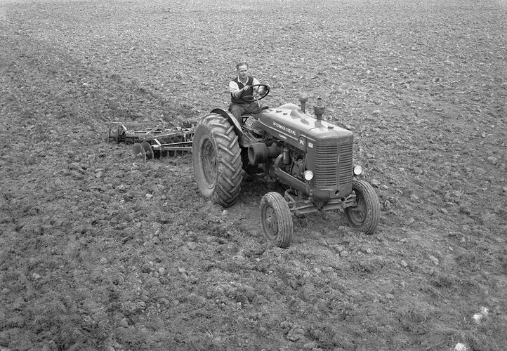 A McCormick-Deering W6 tractor and GL-9A disc harrow at the property of Mr Sherwin, Beveridge, Victoria.