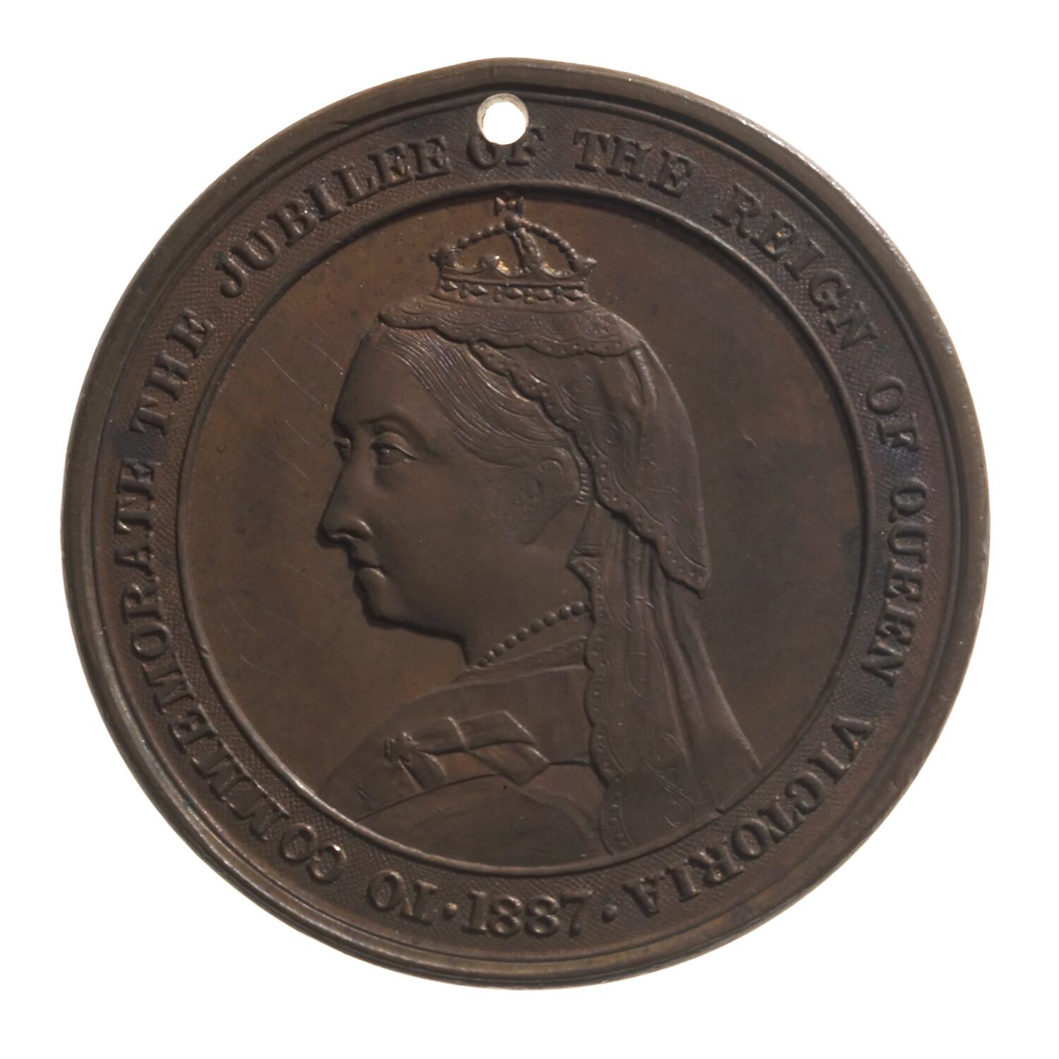 Bust of Queen Victoria left but with head slightly front so that her right eye can just be seen, wearing small crown. Around, TO COMMEMORATE THE JUBILEE OF THE REIGN OF QUEEN VICTORIA . 1887 .