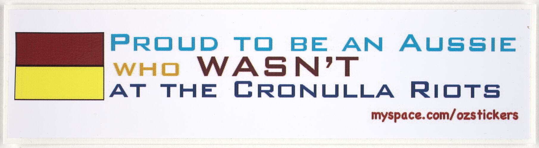 Sticker with the slogan 'Proud To Be An Aussie Who Wasn't At The Cronulla Riots' produced by Australians Against Racism and Discrimination in Sydney in 2008. The sticker was produced to counteract racism in Australian society, and was sold through the social networking sites of MySpace and Facebook in 2008 and 2009, and from 2009 at the website ozstickers.com. The slogan refers to the Cronulla riots which occurred in December 2005.