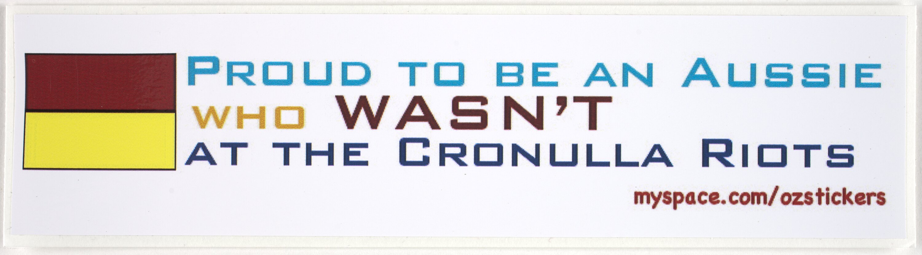Printed, front, blue ink: "Proud to be an Aussie"; underneath in orange "Who" and then brown/ red larger type "Wasn't", below this in dark blue "at the Cronulla riots". Beneath this in red "myspace.com/ozstickers".