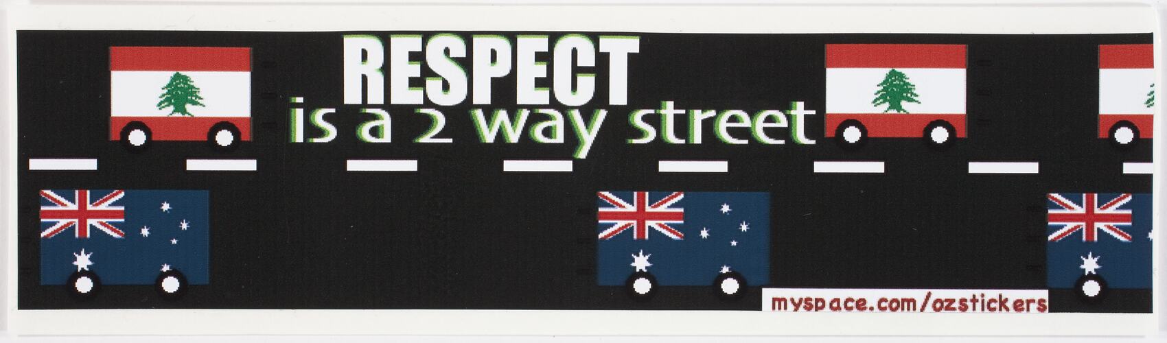 Black sticker on white backing paper. Background is a road with dashed centre line marking. The slogan "Respect is a 2 way street' is typed in the top half in white between two images of the Lebanese flag on wheels. Below this are three Australian flags on wheels. Beneath this in red "myspace.com/ozstickers".