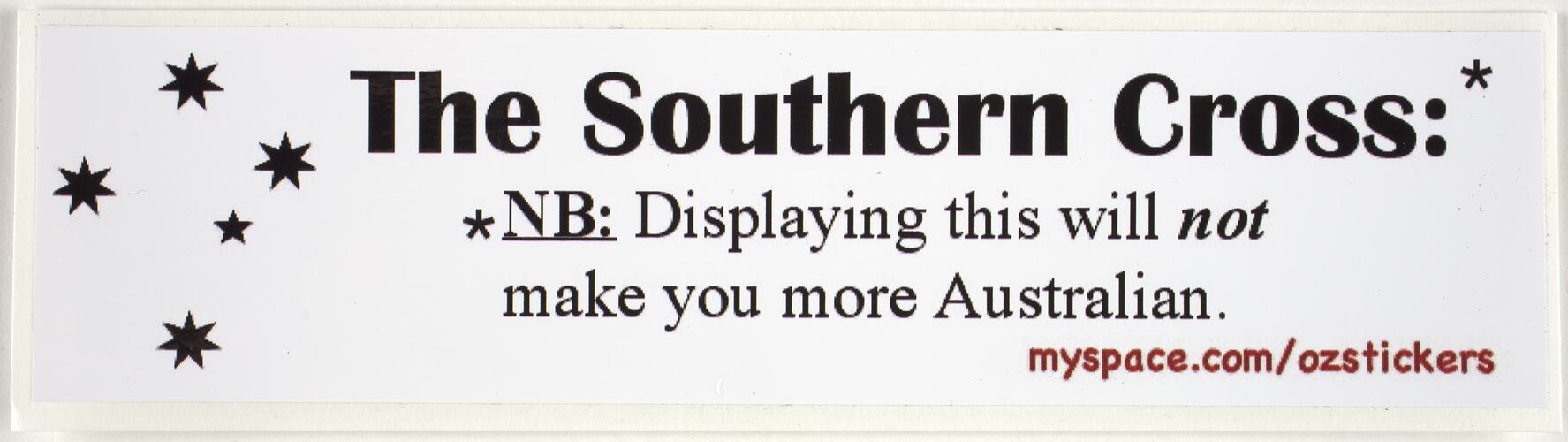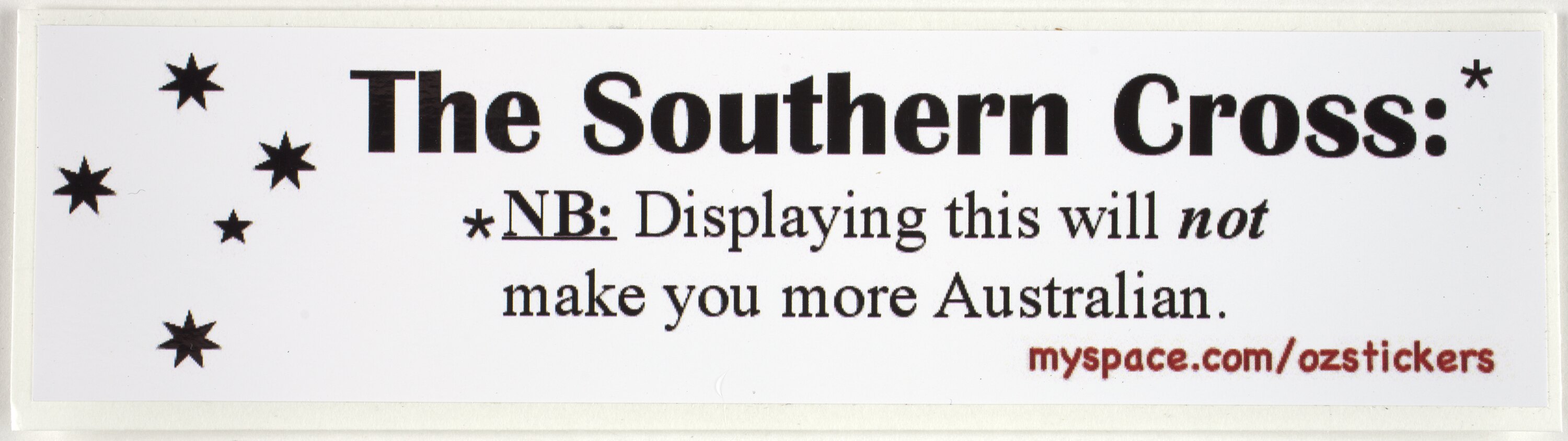 Printed, front, black text: "The Southern Cross*" Beneath this is " * NB: Displaying this will not make you more Australian". Beneath this in red "myspace.com/ozstickers".