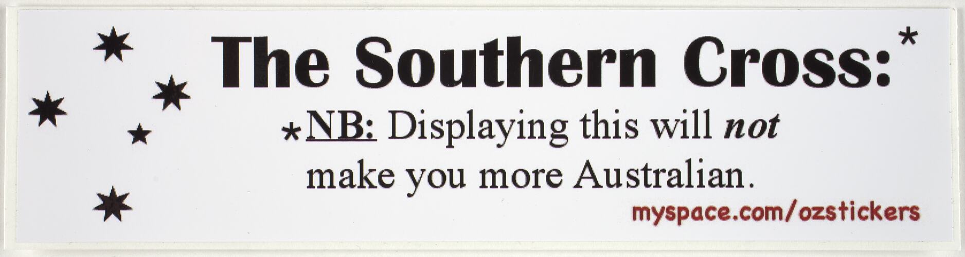Printed, front, black text: "The Southern Cross*" Beneath this is " * NB: Displaying this will not make you more Australian". Beneath this in red "myspace.com/ozstickers".