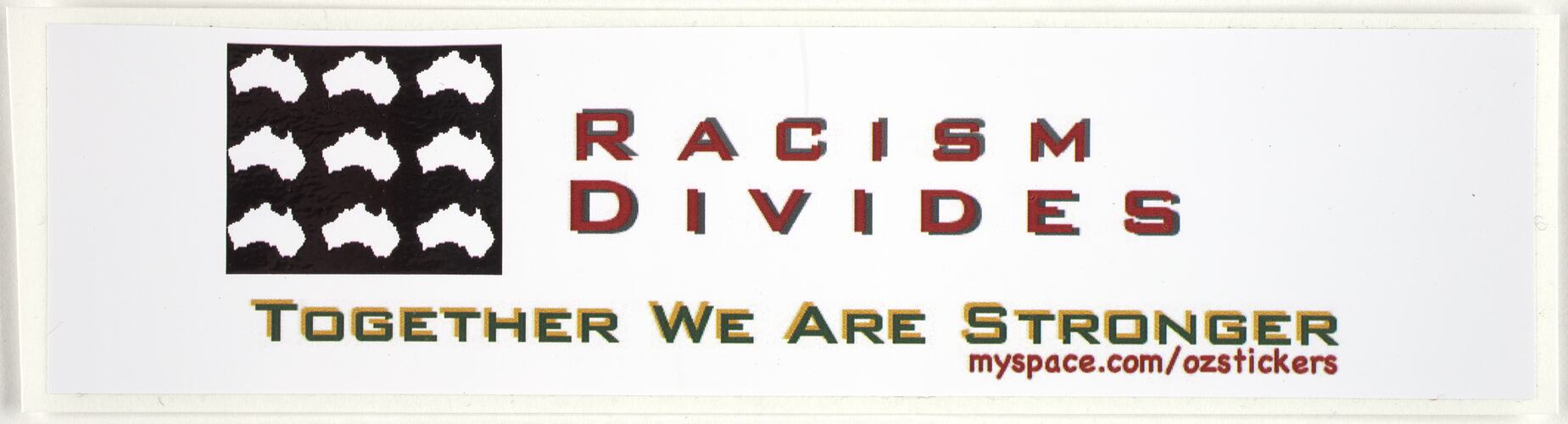 Sticker with the slogan 'Racism Divides Together We Are Stronger' produced by Australians Against Racism and Discrimination in Sydney in 2008. The sticker was produced to counteract racism in Australian society, and was sold through the social networking sites of MySpace and Facebook in 2008 and 2009, and from 2009 at the website ozstickers.com. The slogan is a call to come together as a society rather than fragment into smaller, fractious and less powerful groups.