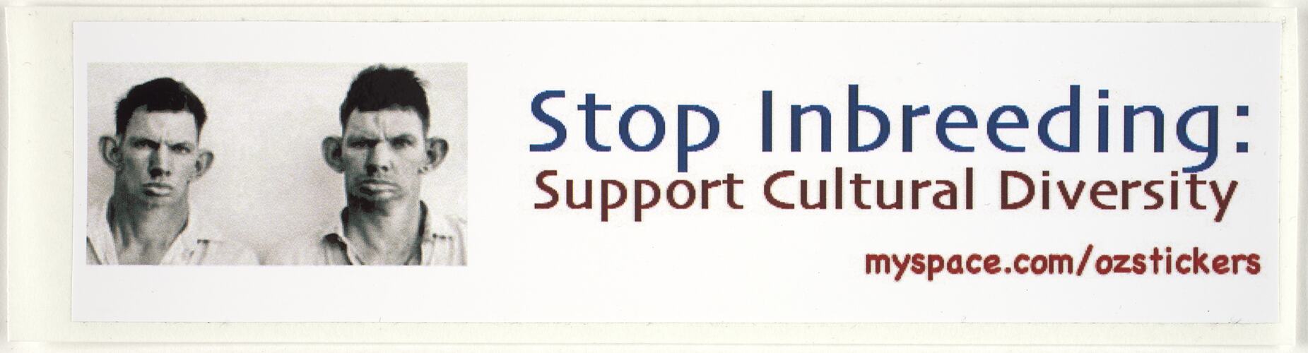 White sticker on white backing paper. Photo on left hand side of two dark haired men. To the right of this is the text in dark blue "Stop Inbreeding:" Beneath this in dark red "Support cultural Diversity" Beneath this in a brighter red "myspace.com/ozstickers".