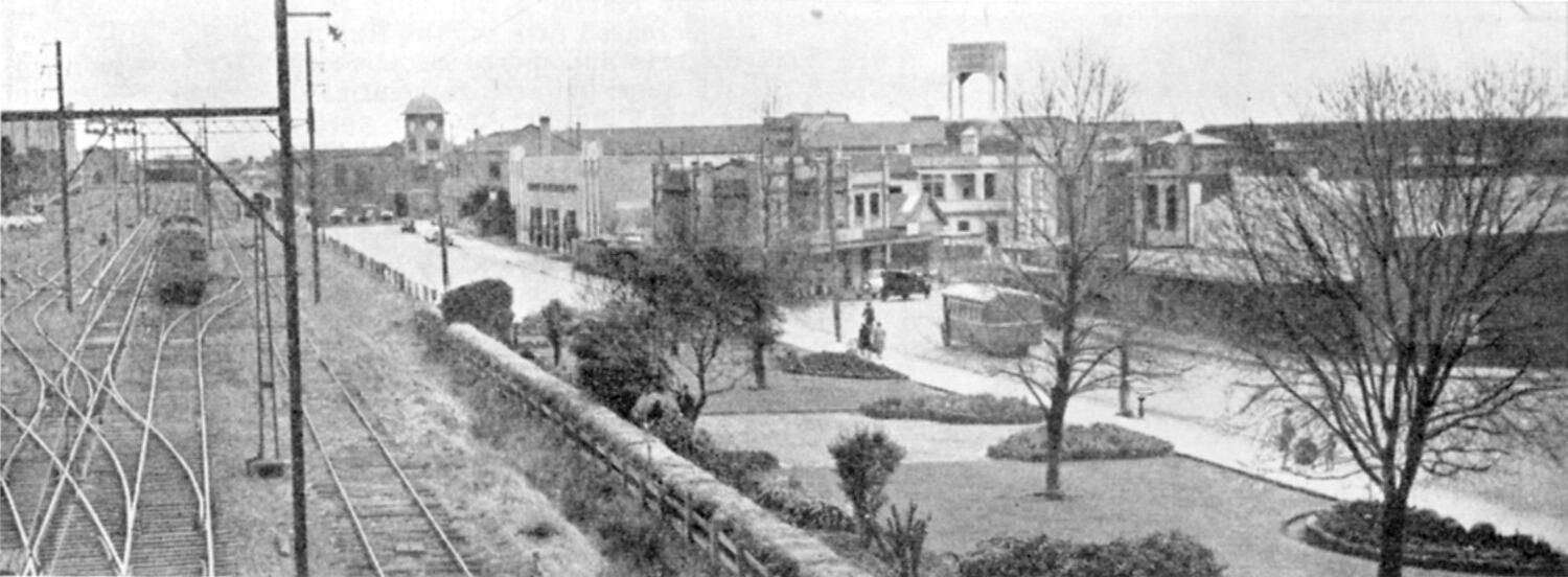 View looking north along Melbourne-Bendigo Railway from Sunshine Railway Station showing junction for railway to Ballarat, overhead wiring for suburban electric trains and an approaching electric passenger train. To the right is the suburb of Sunshine. Running along the railway line are landscaped gardens and a road leading to Sunshine Harvester Works in the background (the works clocktower is just visible). In the foreground is part of the main commerical street of Sunshine with shops, general commercial buildings, cars, a motor bus and people visible. The trees in foreground are missing their leaves, indicating Autumn or Winter season.