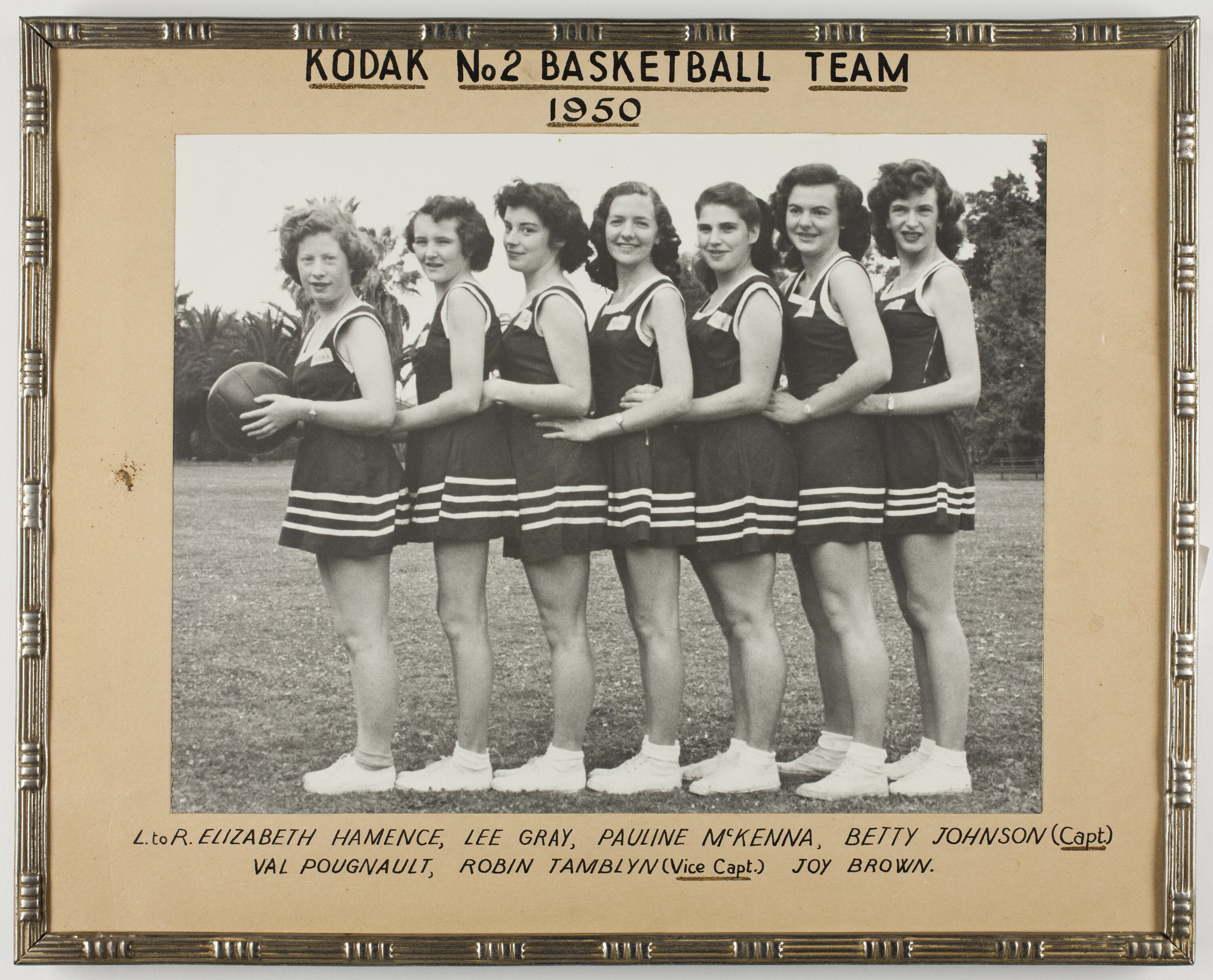 Above image, handwritten, black ink with underlining: "KODAK No 2 BASKETBALL TEAM / 1950" Below image, handwritten, black ink with underlining of Capt and V.Capt: "L. to R. ELIZABETH HAMENCE, LEE GRAY, PAULINE McKENNA, BETTY JOHNSON (Capt.) / VAL POUGNAULT, ROBIN TAMBLYN (Vice Capt.) JOY BROWN."