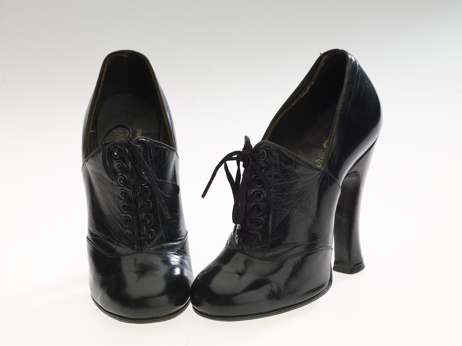 Pair of high-heeled black lace-up shoes with Louis heel. Heel slightly flared to sole. Rounded toe; square throat. Small size; well-worn, but soles appear original.
