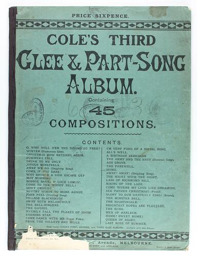 Front cover, printed, black ink: "PRICE SIXPENCE / COLE'S THIRD / GLEE & PART SONG ALBUM. / CONTAINING 45 COMPOSITIONS" and further text within.