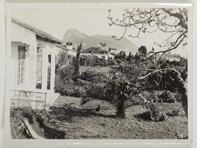 Black and white photograph depicting a view of of the Rock of Gibraltar, taken from the garden of a domestic house circa 1936. The house is to the left of the composition, with a tiled roof, white walls and a small terrace looking out over a garden with a palm and fig tree. There is a deck chair visible in the foreground of the composition.