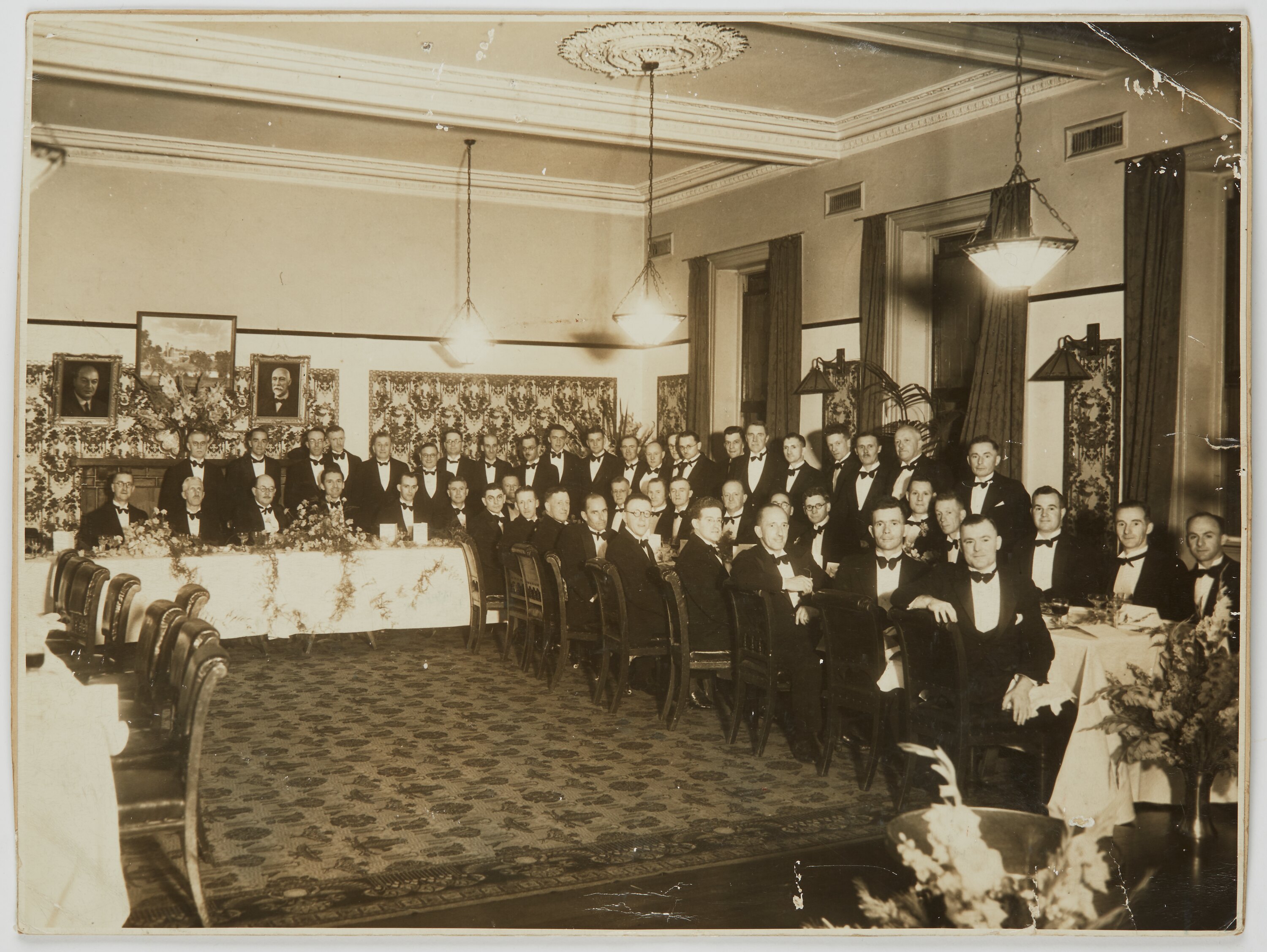 Framed photograph featuring a large group of men, dressed in tuxedos, gathered around dining tables in a horseshoe shape, in a formal dining room. Some men are sitting, some are standing. On the back wall is a landscape photograph of a factory and portraits of two men (John Joseph (JJ) Rouse and Thomas Baker) on either side of this. There are three pendant lights suspended from the ceiling.