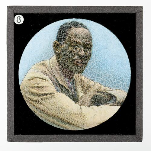 Lantern slide depicting a head and shoulders portrait of Khama. It is part of an incomplete set of 40 slides, two are missing, illustrating highlights from Livingstone's life and travels. These slides were manufactured by the London Stereoscopic & Photographic Company for The London Missionary Society, circa 1900.