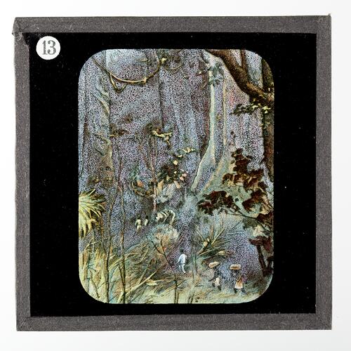 Lantern slide depicting people walking through an equatorial forest in Africa including First Nations people carrying bundles. It is part of an incomplete set of 40 slides, two are missing, illustrating highlights from Livingstone's life and travels. These slides were manufactured by the London Stereoscopic & Photographic Company for The London Missionary Society, circa 1900.