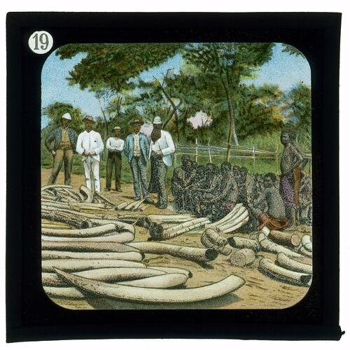 Lantern slide depicting ivory laid out on the ground with people sitting and standing around them. It is part of an incomplete set of 40 slides, two are missing, illustrating highlights from Livingstone's life and travels. These slides were manufactured by the London Stereoscopic & Photographic Company for the The London Missionary Society, circa 1900.