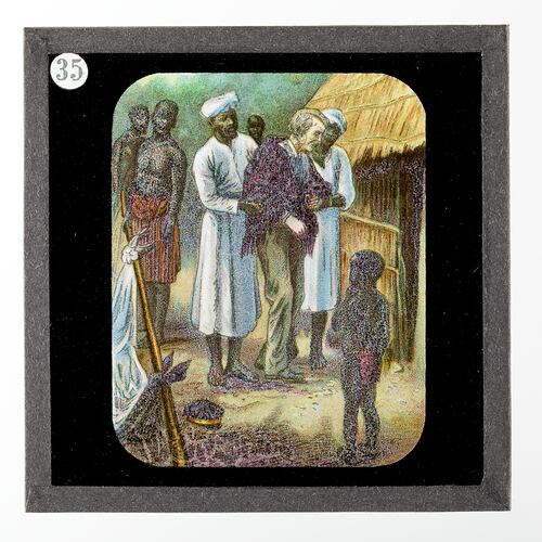 Lantern slide depicting David Livingstone being assisted into a hut. It is part of an incomplete set of 40 slides, two are missing, illustrating highlights from Livingstone's life and travels. These slides were manufactured by the London Stereoscopic & Photographic Company for The London Missionary Society, circa 1900.