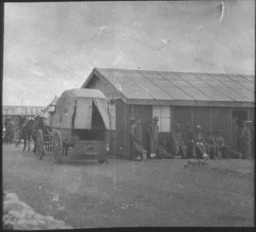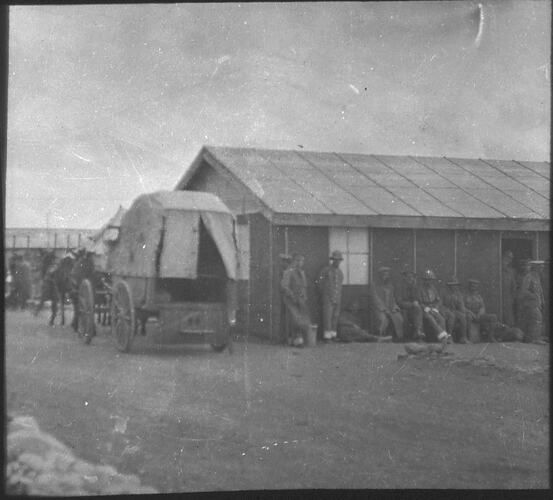 Lantern slide depicting a group of Australian soldiers in front of a hut in an army encampment during World War I. A horse-drawn wagon is visible.