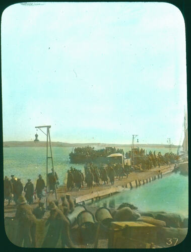 Lantern slide depicting a contingent of Australian soldiers on a wharf dissembarking.