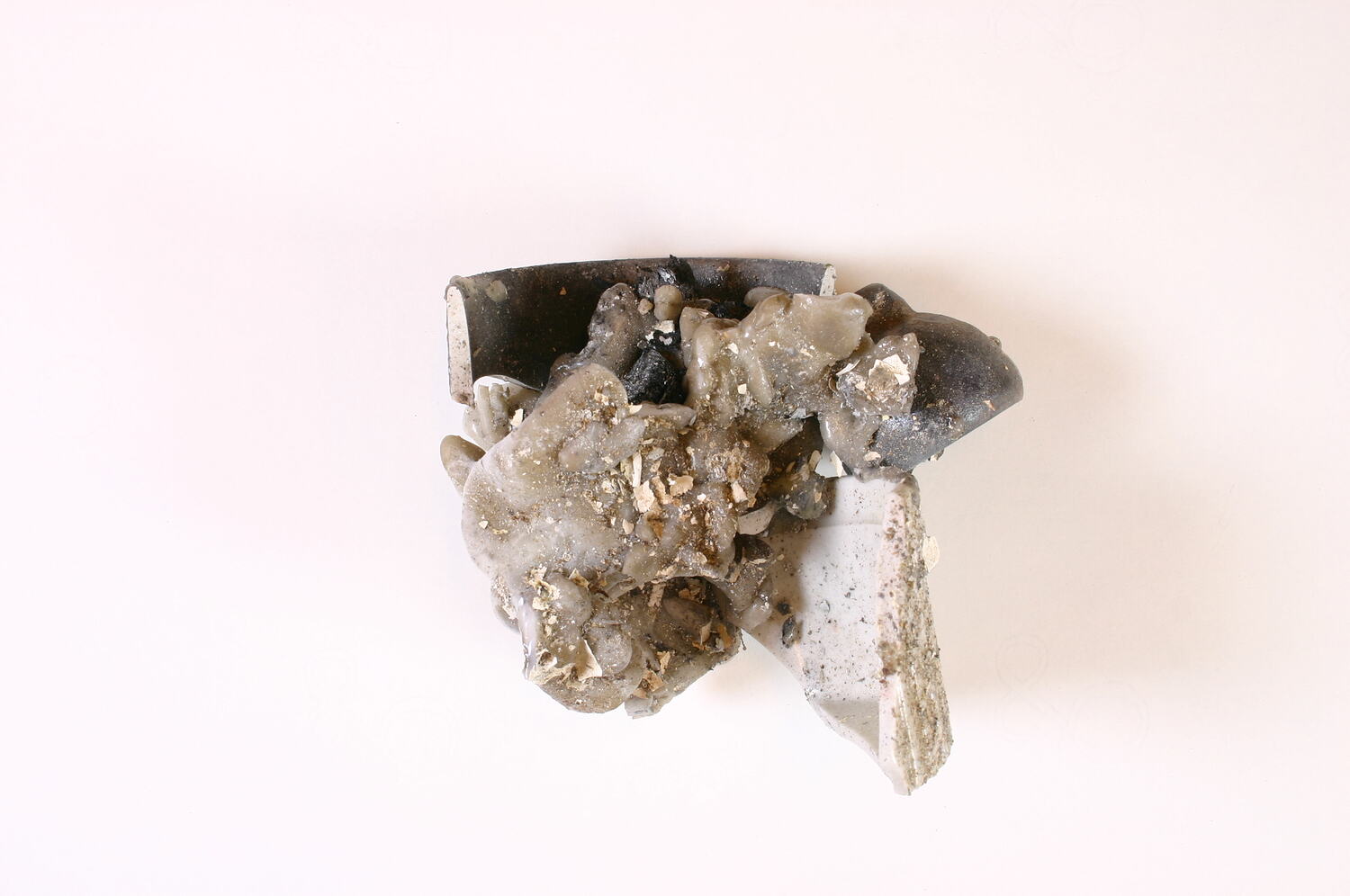 Broken pieces of two small ceramic bowls, one green stoneware and one fluted white small soufflé bowl. Both are fused together by a melted mass of ceramic to which a broken egg cup is also adhered.