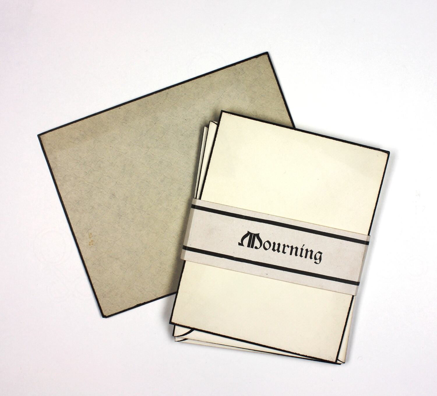 Set of stationery consisting of seven off-white envelopes with black borders, secured with a paper strip inscribed 'Mourning'. A larger envelope accompanies the group, also off-white with a black border.