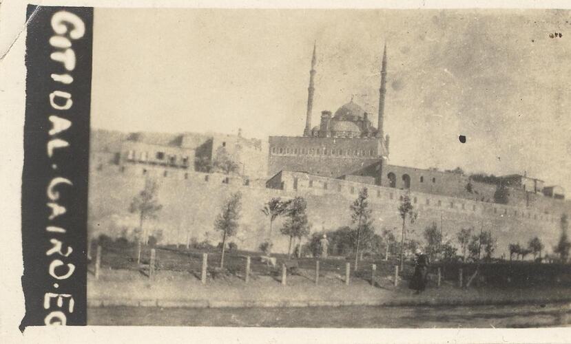 On front, part of photographic printing: 'CITADEL CAIRO' Incribed in pencil on back: 'This is a picture of the Citadel it is a beautiful building and contains a beautiful Mosque which you can see. It is a strong fortress used in olden times to defend Cairo + is now Garrisonia [?] by thousands of our British troops'